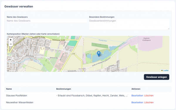 Es ist jederzeit möglich die Gewässer abzuändern (Name, Standort, Bestimmungen) oder zu löschen.